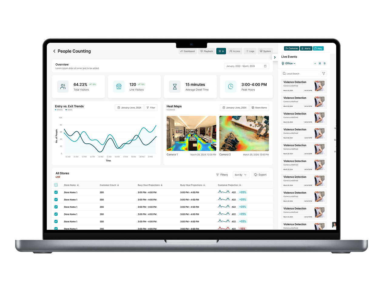AI-driven workflows initiate alarms, trigger PTZ movements,& send real-time alerts.
